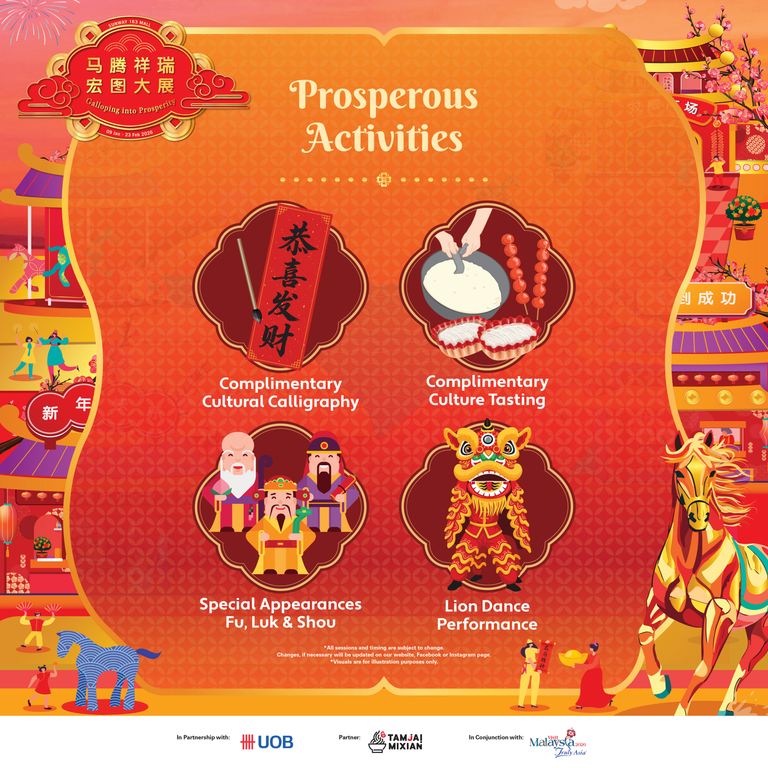 Enjoy complimentary cultural calligraphy, where you can bring home auspicious wishes for the new year, and complimentary cultural tastings featuring festive flavours symbolic of prosperity and abundance. Look out for special festive appearances throughout the event, adding excitement and delight for all ages.